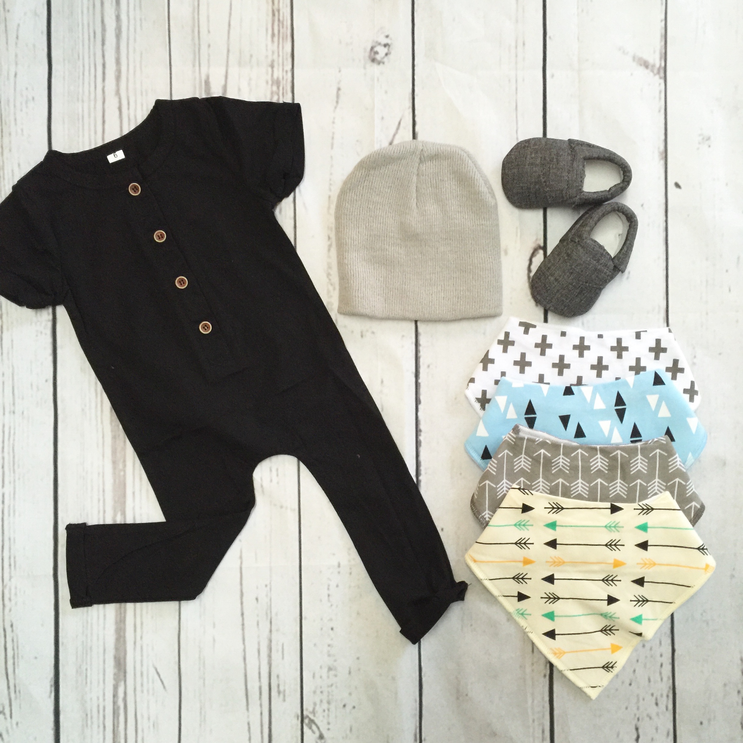 The softest black cotton romper, 4 stylish adjustable bandana bibs, a gray ribbed knit beanie and dark grey gentleman moccasins make this the perfect outfit from head to toe!