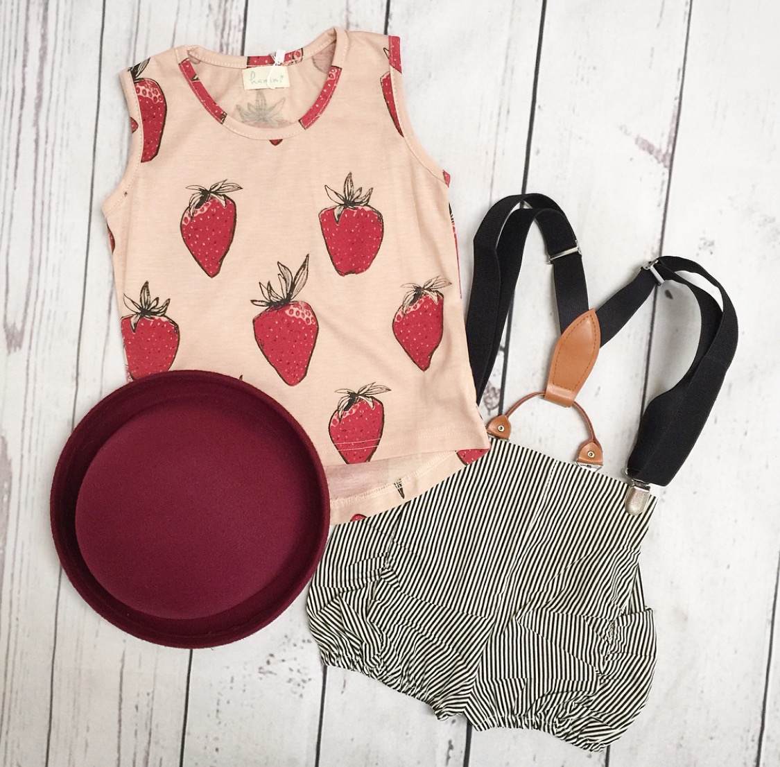 Take your little ones style to the next level! This box includes an ultra soft strawberry tank, heavenly high-waisted shorts, super cute suspenders and a maroon hat to top off the perfect look!