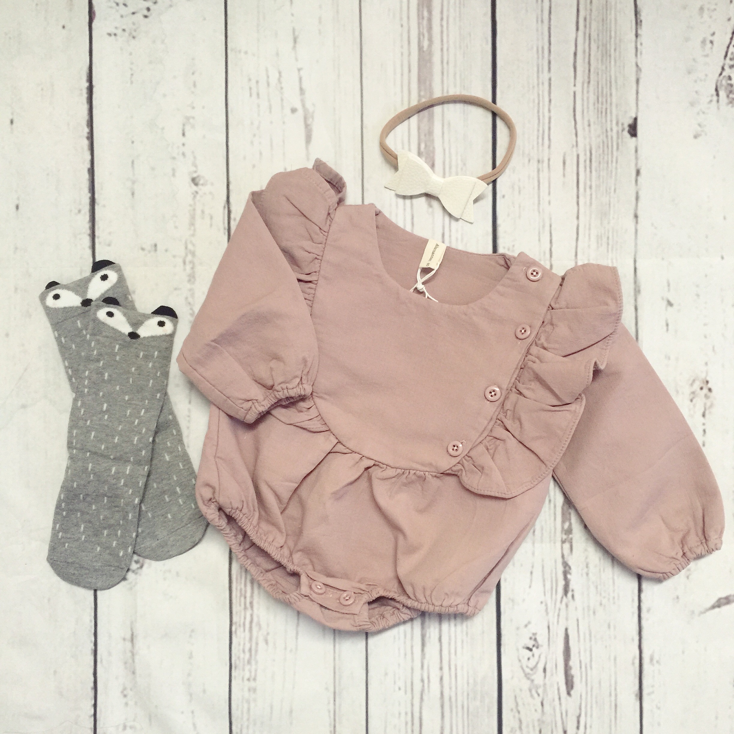 A sweet, ruffle lined, long sleeve romper. Gray fox knee sox and a white pleather bow headband. The sweetest little outfit for the sweetest little one.