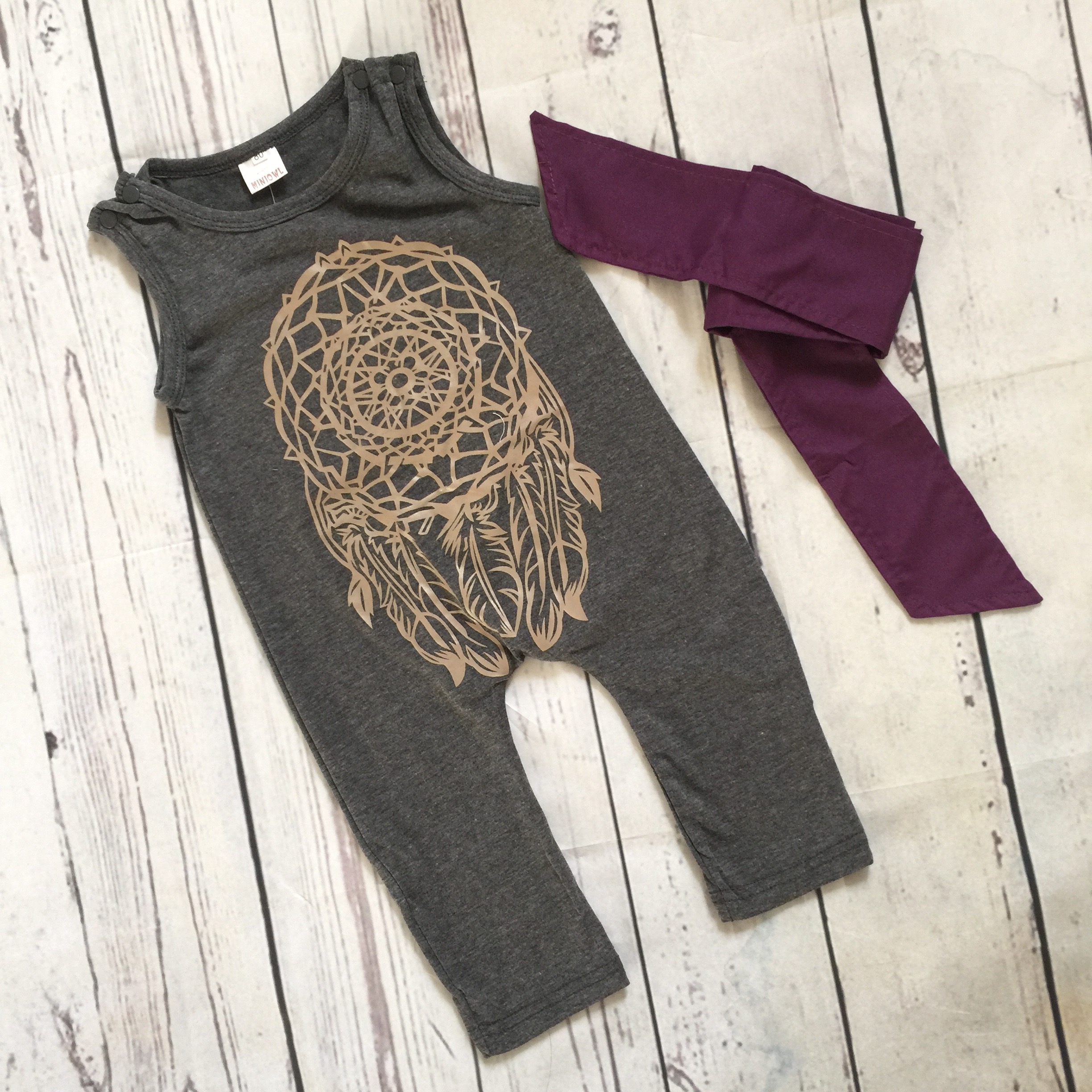 This box includes a cozy, stretch, dream catcher print grey romper and an eggplant colored head wrap.