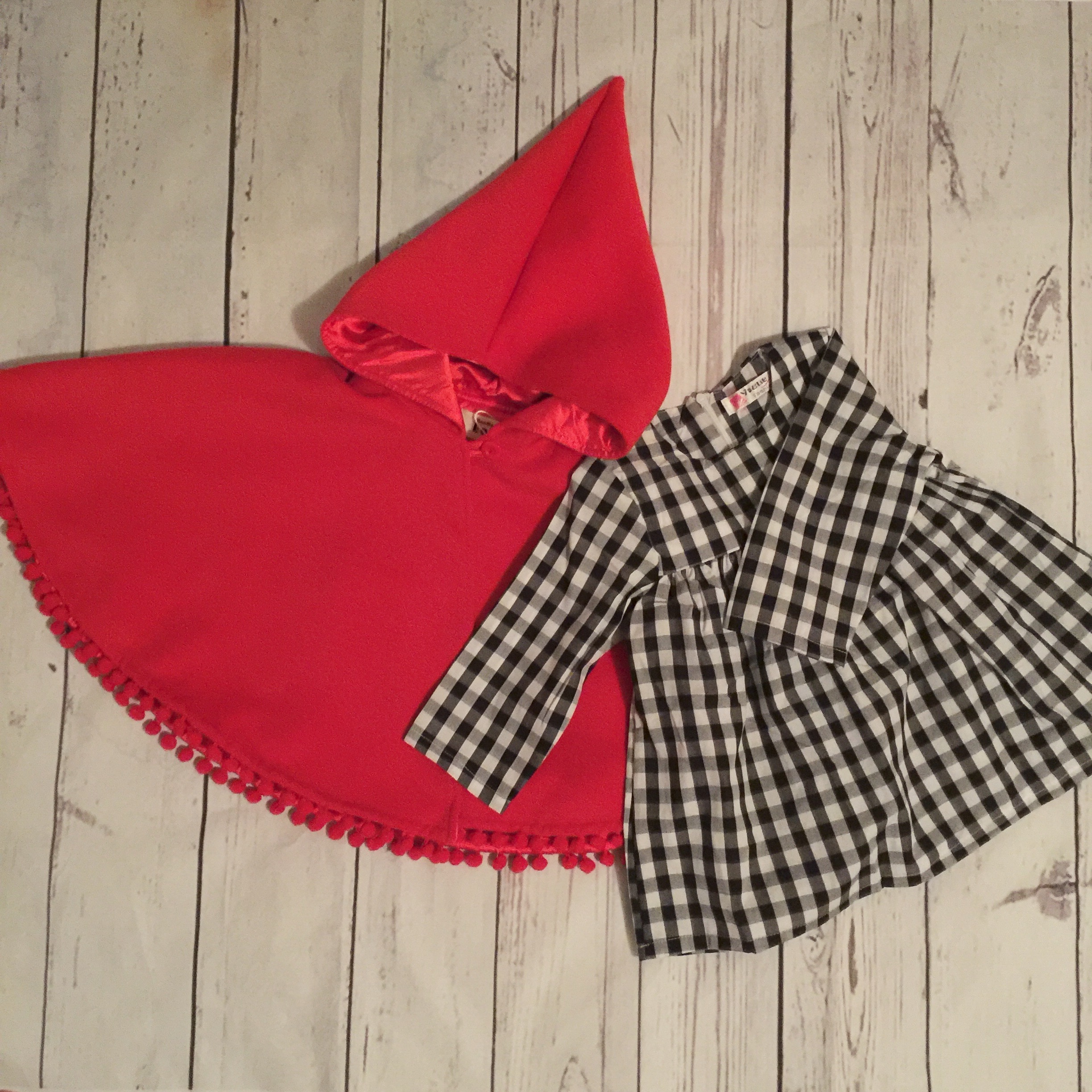 A sweet, short, plaid dress with a heavy red hooded cape will have you singing all the way to grandmas house!!